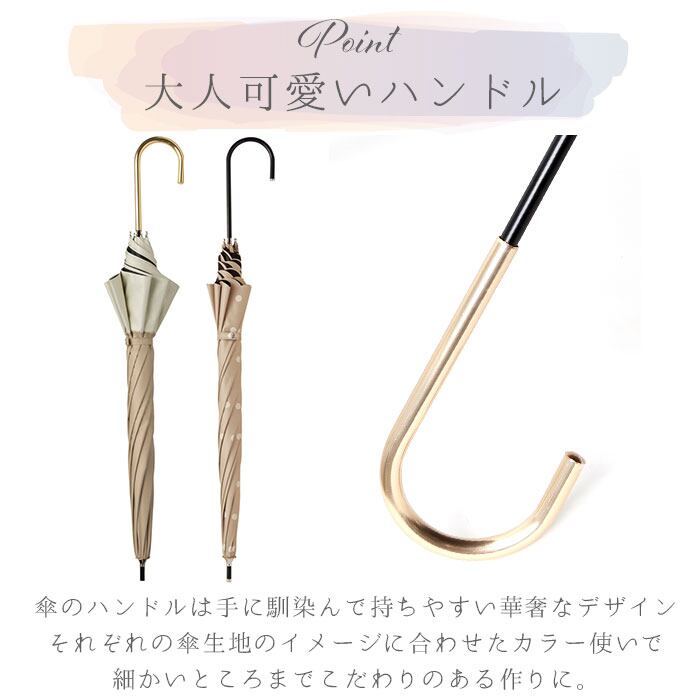 ・傘のハンドルは手に馴染んで持ちやすい華奢なデザイン。それぞれの傘生地のイメージに合わせたカラー使いで細かいところまでこだわりのある作りに。