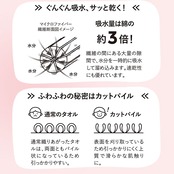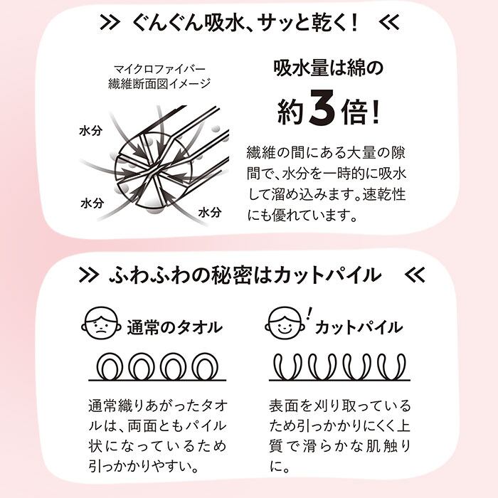 ・生地は吸水量が綿の約3倍のマイクロファイバー素材。繊維の間にある大量の隙間で水分を一時的にため込んで、グングン吸水!通気性に優れた繊維なのでお洗濯後もすぐ乾く!