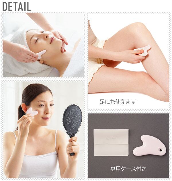 「かっさ」とは水牛の角や天然石のプレートを使って皮膚を擦るように刺激する、古来より中国に伝わる美容法のひとつです。冷んやりと滑りがよく、肌にフィット!3つの曲線でマッサージしましょう!かっさプレートで顔のコリをほぐしスッキリ小顔に!週1〜2回、洗顔後、化粧水で肌を整えたあとに市販のマッサージクリームをなじませ、かっさリフトプレートでマッサージします。1日10分以内で頬がほんのり赤くなる程度が目安です。お風呂上りがおススメです♪