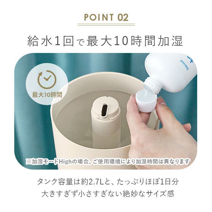 ・給水1回で約10時間連続加湿。香りを長く手軽に楽しめるのが嬉しい♪(※加湿モードHighの場合。ご使用環境により加湿時間は異なります。)