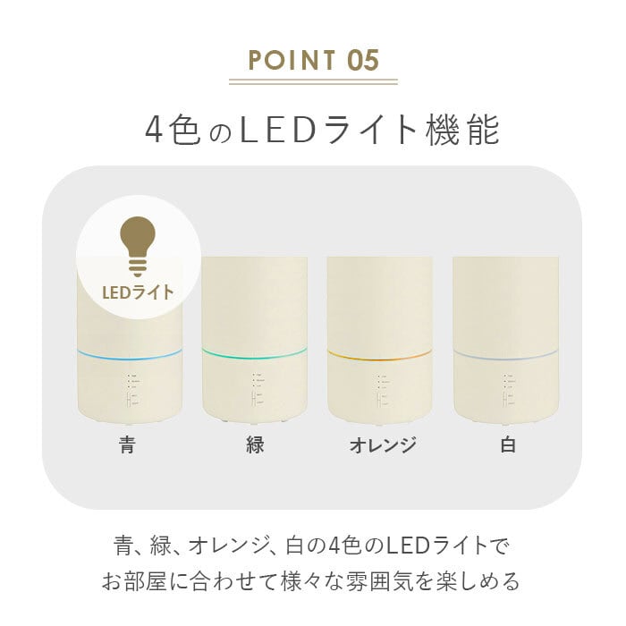 4色のLEDライト(水色、黄緑、オレンジ、白)で様々な雰囲気を楽しめる♪
