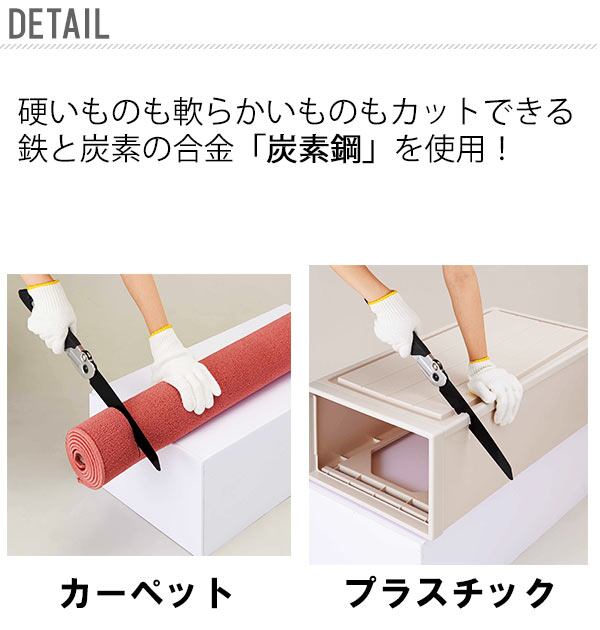 カーペット、レンガ、ステンレス、プラスチック、鉄などいろんな素材が切れ、粗大ゴミの解体に便利なノコギリです。
