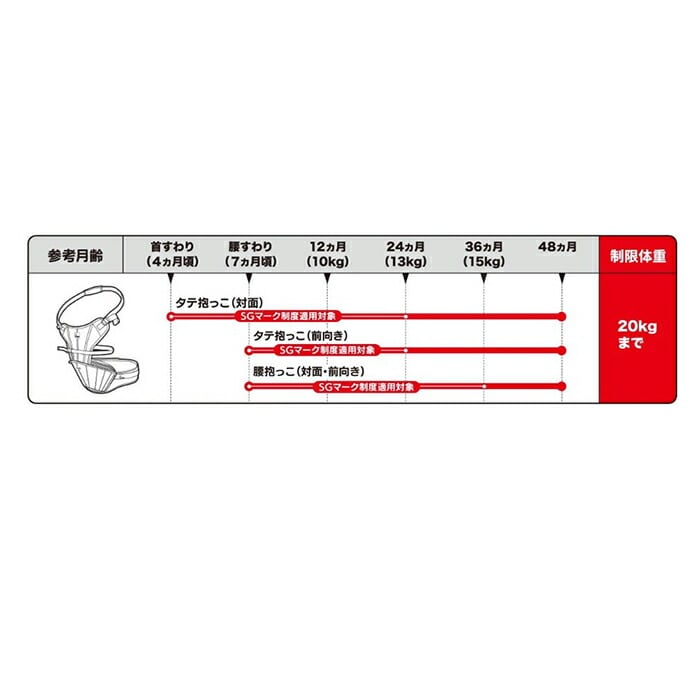 ・首すわりの新生児(4ヶ月頃)から48ヵ月(制限体重20kg)までと、長く使えるアイテム。(※お子様の発育には個人差がありますので、月齢は目安にしてください。)