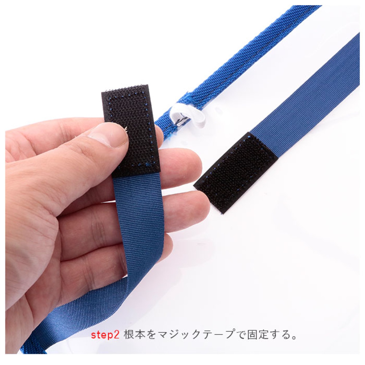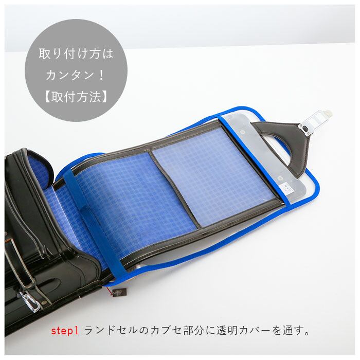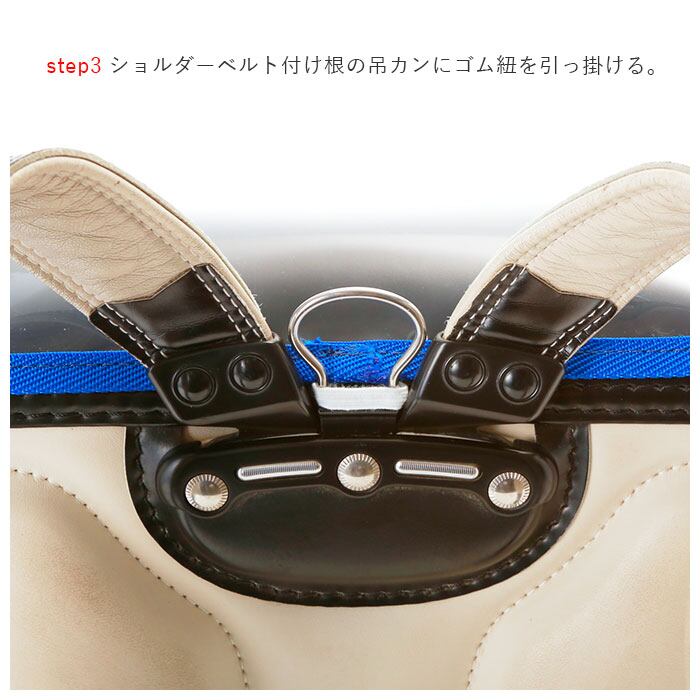 ・取り付け方はカンタン!ランドセルのカブセ部分に透明カバーを通して、根本をマジックテープで固定。ショルダーベルト付け根の吊カンにゴム紐を引っ掛けるだけ。