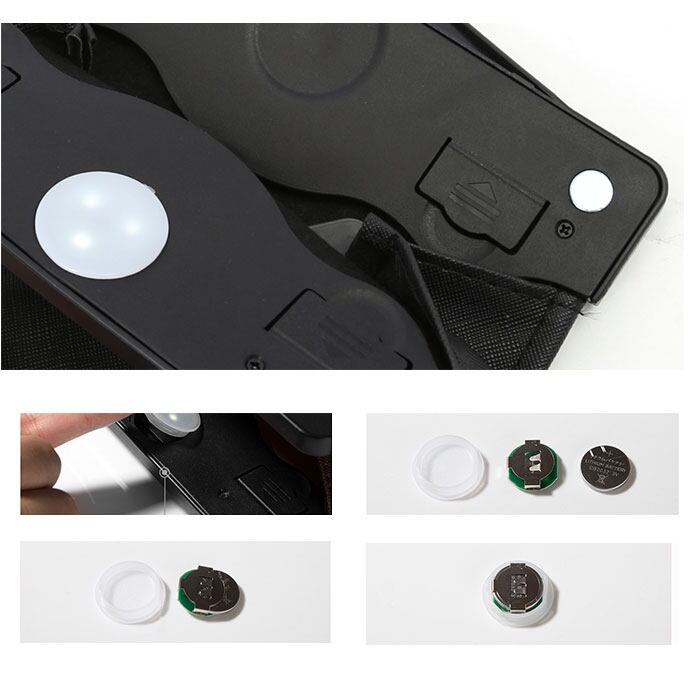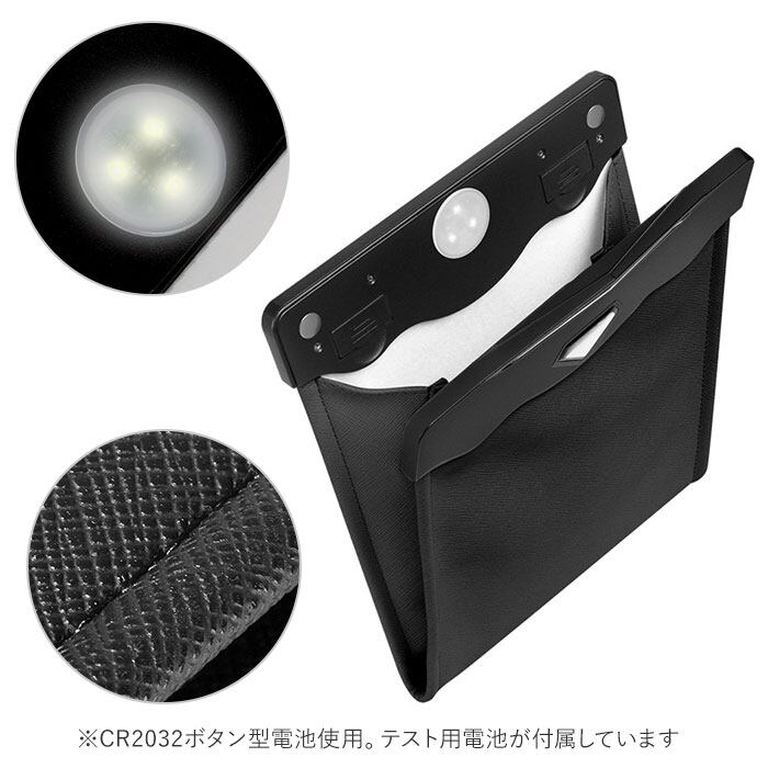・ゴミ箱を開けると内蔵LEDライトが手元を照らしてくれるため、夜間の後部座席や運転席の脇など薄暗いスペースでも使いやすいのがポイント。(※CR2032ボタン型電池使用。テスト用電池が付属しています。)