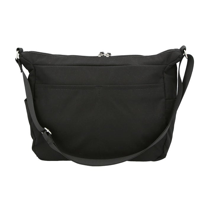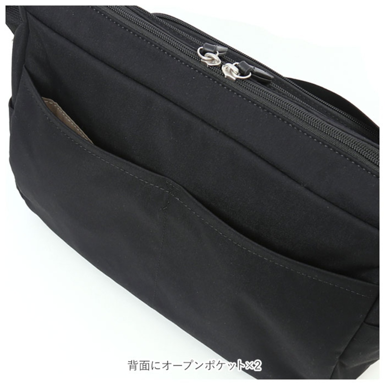 ・前面に大きめサイズのファスナーポケット、背面にオープンポケット×2、両サイドにオープンポケットを配置。