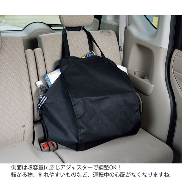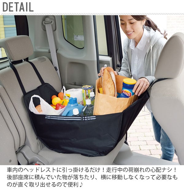 車内のヘッドレストに引っ掛けるだけ!走行中の荷崩れの心配ナシ!いつものお買い物でのエコバッグとしてはモチロン、キャンプやバーベキュー、海水浴などのアウトドアレジャー、車中泊など、たくさんの荷物を運ぶときに便利ですね!