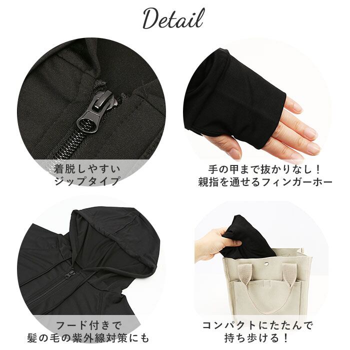 ・着脱しやすいジップパーカータイプ。フードをかぶれば、首や頭部を紫外線からガード!