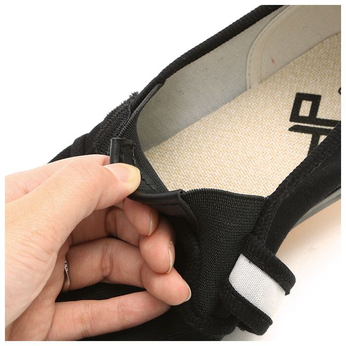・履き口の甲部分はゴム仕様でフィットしやすく、ストラップベルトも付いているので、しゃがんだ時も脱げにくい!