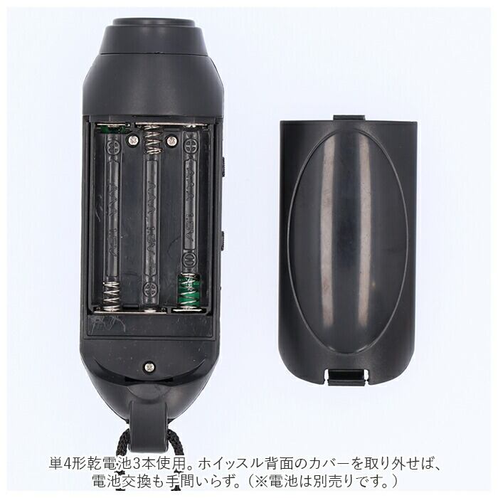 ・単4形乾電池3本使用。ホイッスル背面のカバーを取り外せば、電池交換も手間いらず。(※電池は別売りです。)