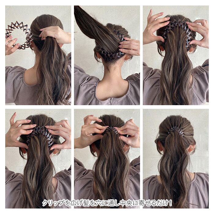 ・クリップを広げ髪を穴に通し中央に寄せるだけ!内側のコームでしっかりホールドされるから、まとめ髪に最適◎