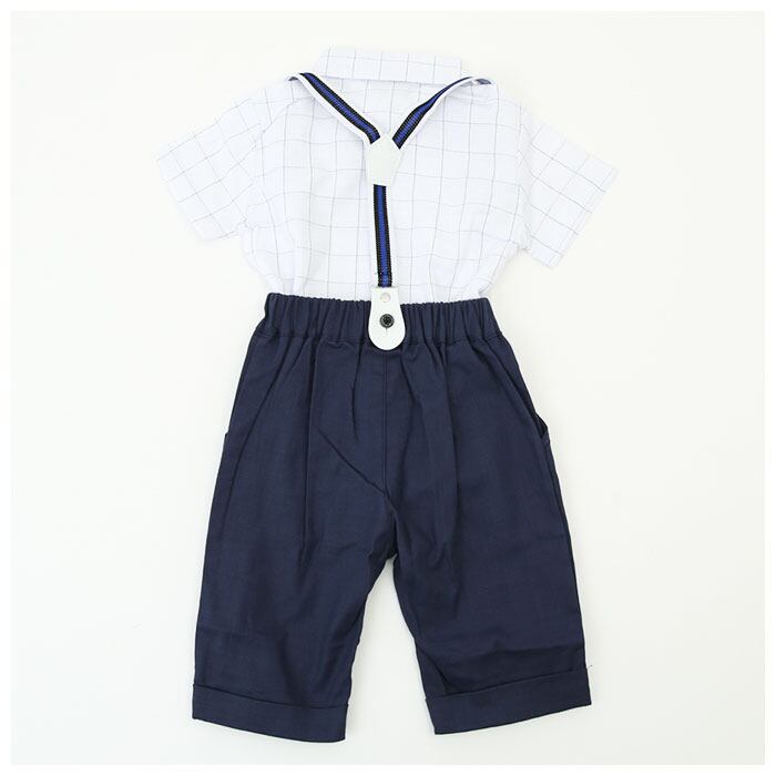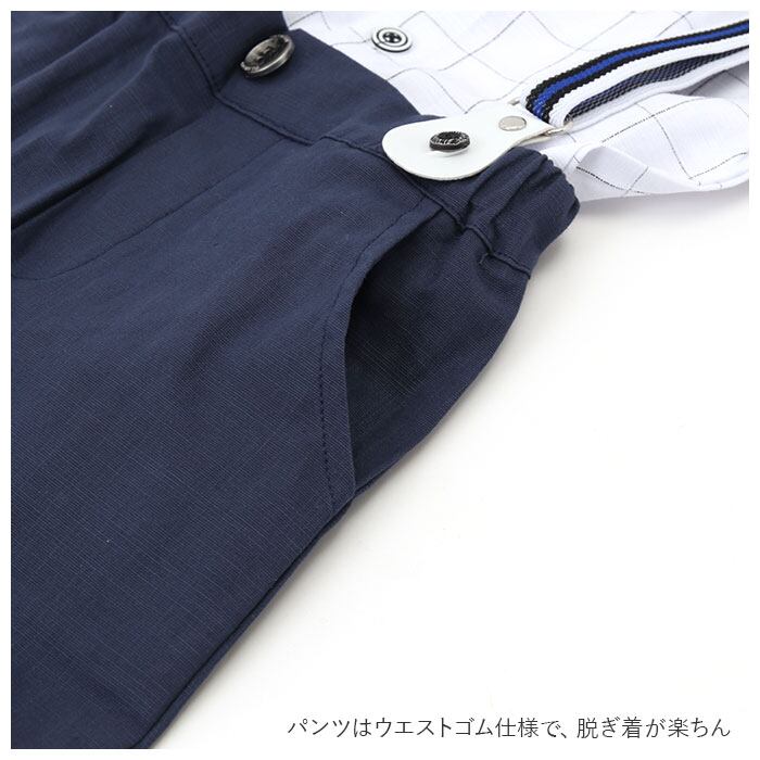 ・パンツはウエストゴム仕様で、脱ぎ着が楽ちん。ボタンで着脱可能なサスペンダー付き。