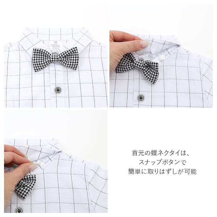 ・シャツは、夏でも着用できる半袖タイプ。首元の蝶ネクタイは、スナップボタンで簡単に取りはずしが可能。