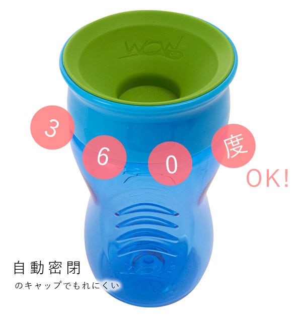 ※WOW CUP(R)は、360度EVEN-SEAL(R)によってフタをしたまま360度どこからでも飲める不思議なカップです。EVEN-SEAL(R)は、360度どこからでも飲むことができ、吸うのをやめると自然にシリコンキャップが閉まる特殊技術です。