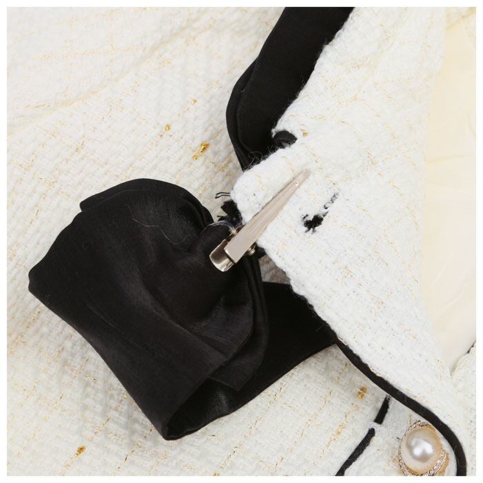 ・ジャケットは大きなパール調のボタンが使われていて、おしゃれなアクセントに。左右にハンカチやちょっとしたお菓子を入れられるポケット付き。