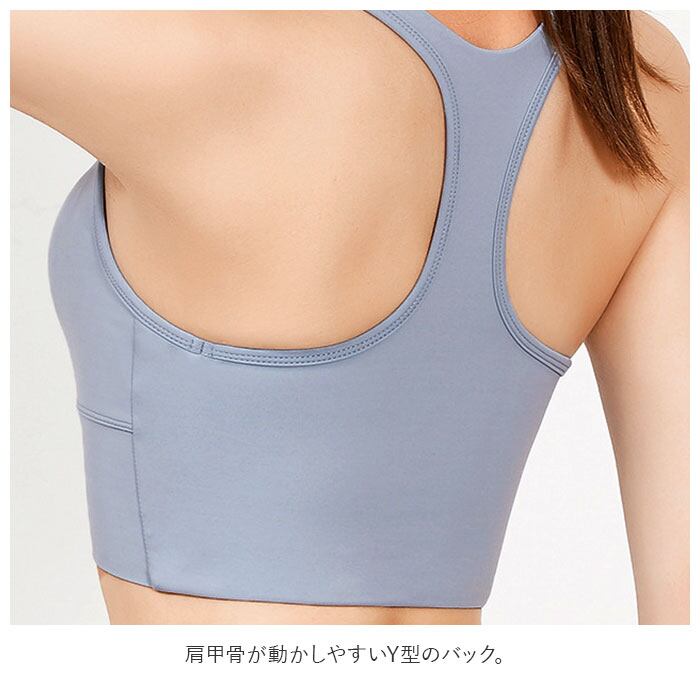 ・肩甲骨が動かしやすいY型のバック。肩ひもは少し太めで肩への負担を軽減。