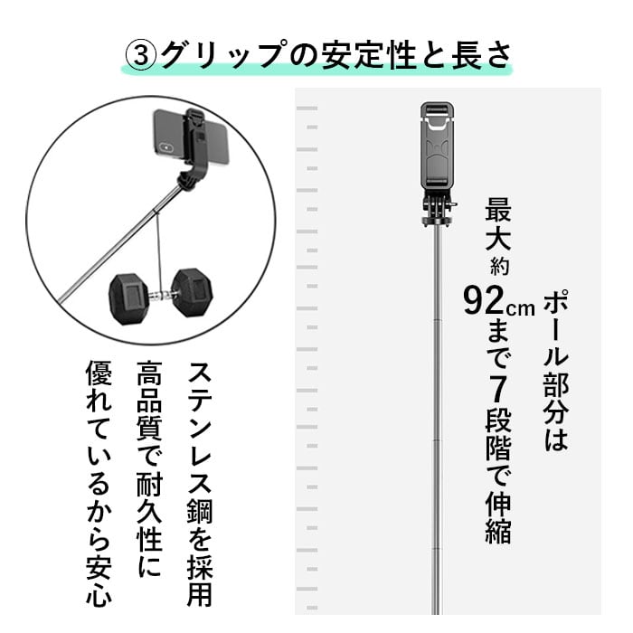 ・ポール部分は最大約92cmまで7段階で伸縮。