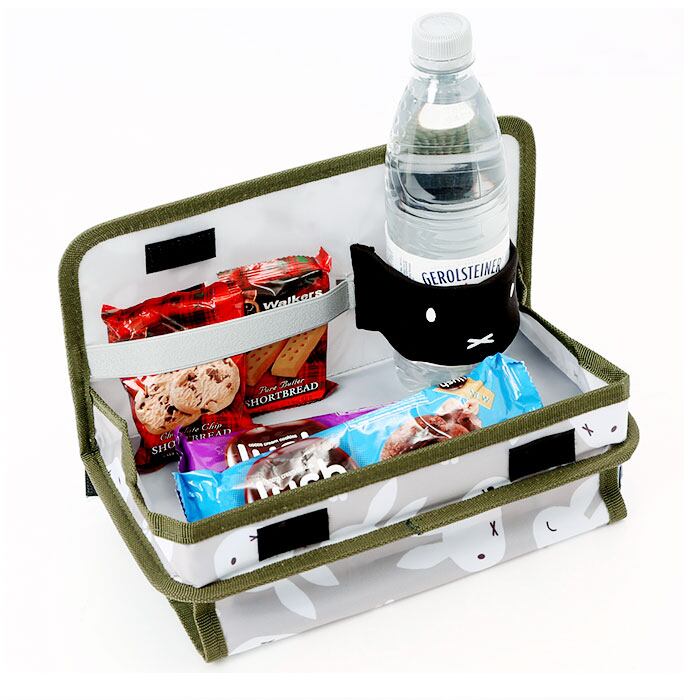 ・トレー部分にはスマホやお菓子を挟めるゴムバンド、ミッフィーのお顔デザイン入りドリンクホルダー付き。