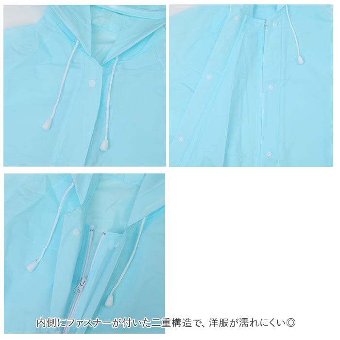 ・フロントは着脱カンタンなスナップボタン式。さらに内側にファスナーが付いた二重構造で、洋服が濡れにくい◎