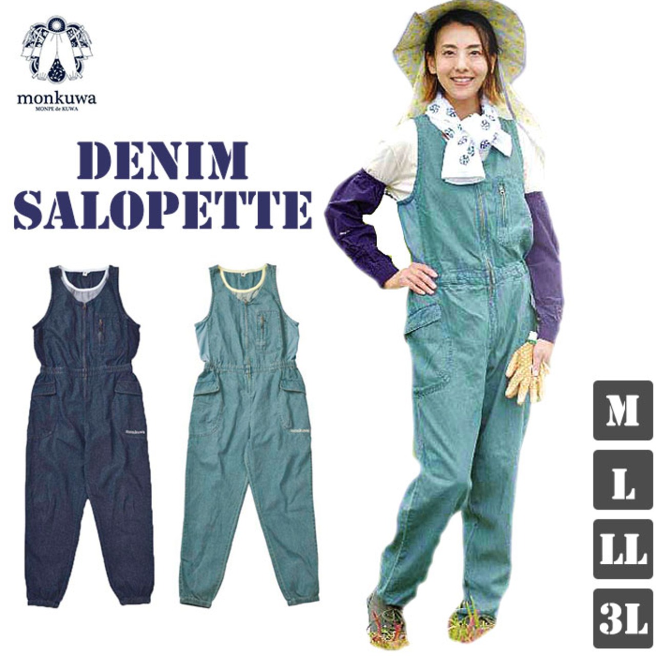 モンクワ サロペット 通販 デニム つなぎ オールインワン 日よけ UVカット 女性用 農作業 紫外線カット ガーデニング 野良着 作業服 園芸 かわいい オーバーオール アウトドア 農業女子 おしゃれ 大きめ 大きい LLサイズ 3Lサイズ Mサイズ Lサイズ