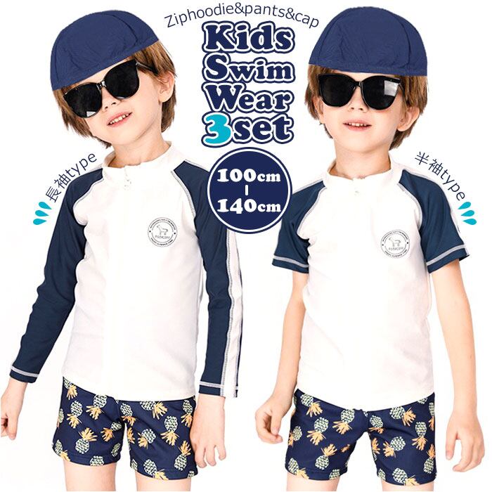 ・手軽に全身コーデがキマる!ジップパーカー・ショートパンツ・キャップのキッズ水着3点セット♪