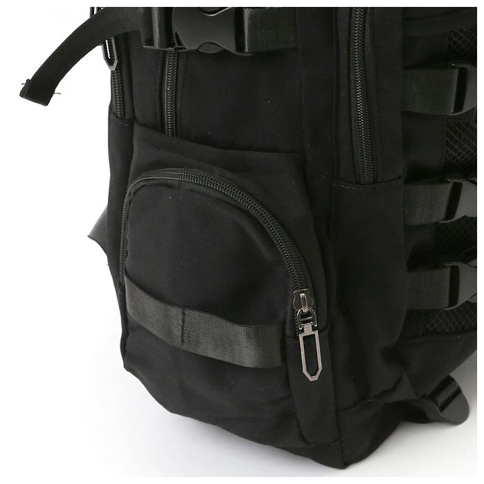 ・両サイドやフロント、底には容量に応じて伸縮可能なバックルベルト付き。