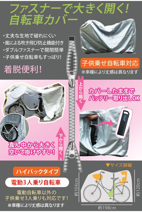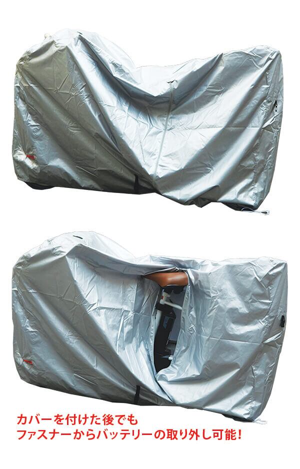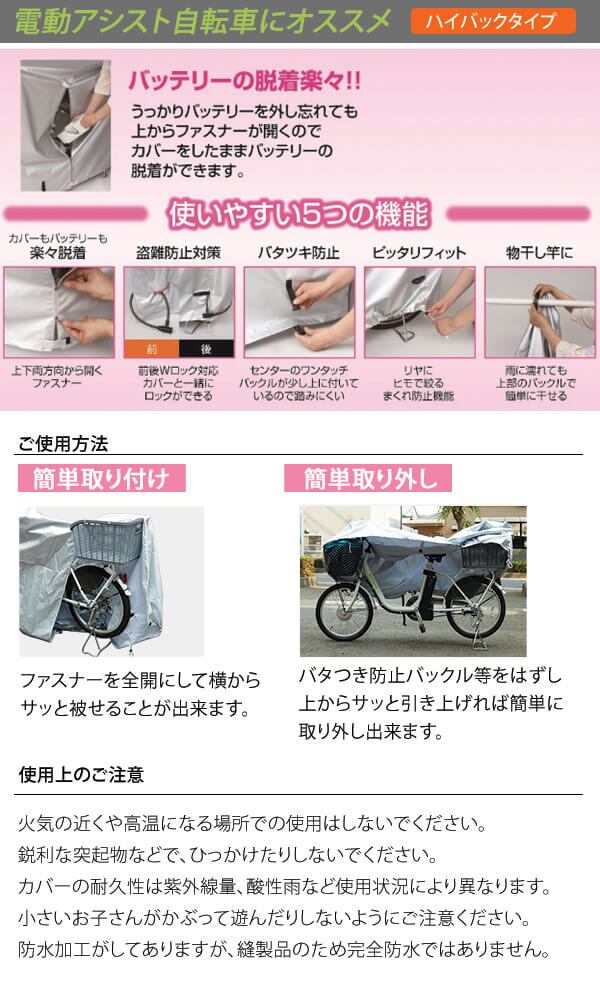 電動アシスト自転車にぴったり♪ついうっかり外し忘れても、ファスナーを上から開くとカバーをしたまま、バッテリーの脱着ができます。下からファスナーを開くと、カバーが大きく広がるので、駐輪場など狭い場所でも横から簡単にカバーが掛けられます。風でファスナーが勝手に開かない押えやバックルを踏みにくい取付位置、カバーの前後がわかる色分けロック穴など細かな配慮も!カバーの取り外しも丈夫のバックルを引き寄せ持ち上げるだけで簡単に外せます。雨に濡れた時も、外したカバーのバックルを繋いで、そのまま物干しなどにつるして干せるので便利です。カバーと一緒にロックができる前後Wロック対応で、盗難防止対策もばっちりです♪