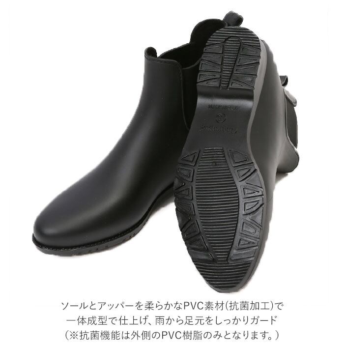 ・ソールとアッパーは柔らかなPVC素材(抗菌加工)を一体成型で仕上げ、雨から足元をしっかりガード。(※抗菌機能は外側のPVC樹脂素材のみとなります。)