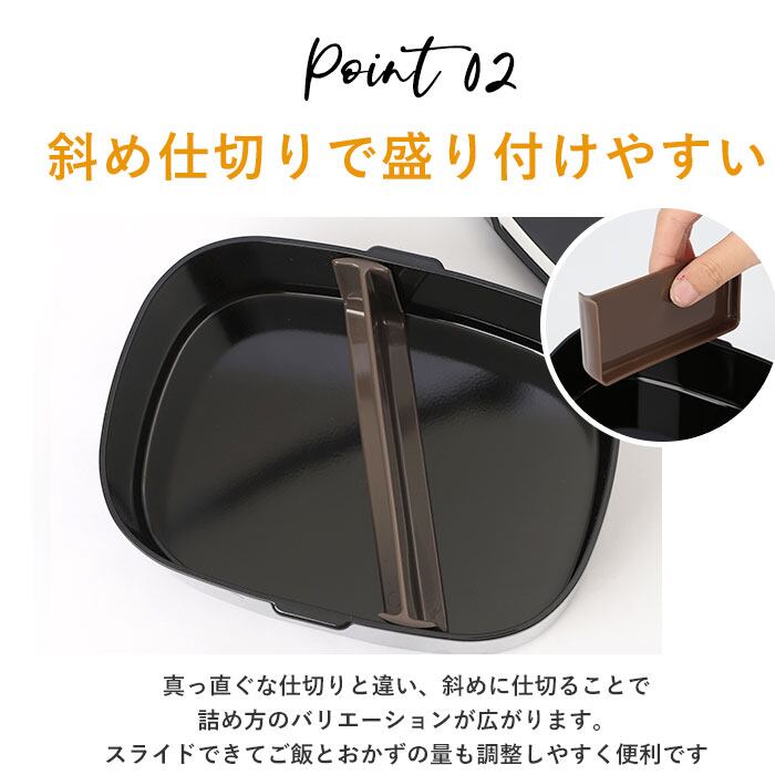 ・斜めにスライドできる中仕切りが付属。メニューに合わせて上手に盛り付けできちゃう♪(※まっすぐに仕切ることはできません。)