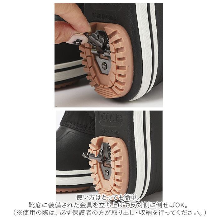 ・使い方はとっても簡単。靴底に装備された金具を立ち上げて反対側に倒せばOK。(※使用の際は、必ず保護者の方が取り出し・収納を行ってください。)
