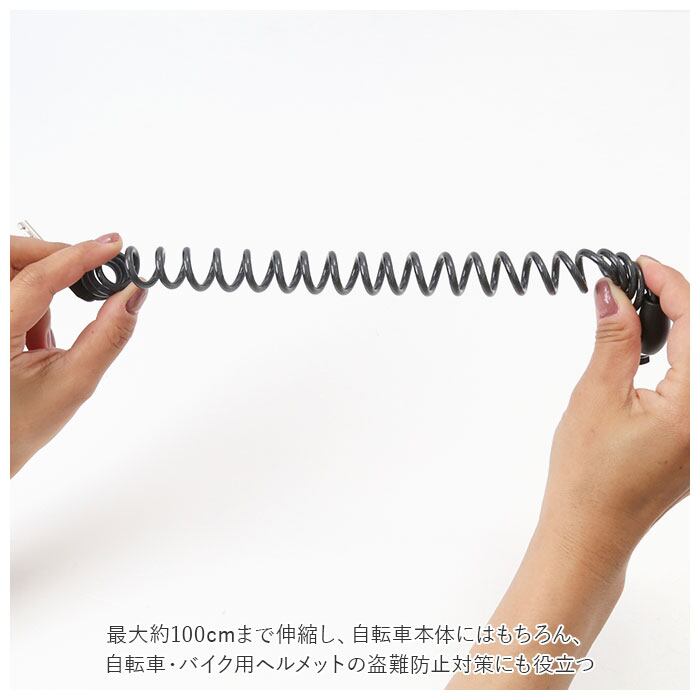 ・最大約100cmまで伸縮し、自転車本体にはもちろん、自転車・バイク用ヘルメットの盗難対策にも役立つ。