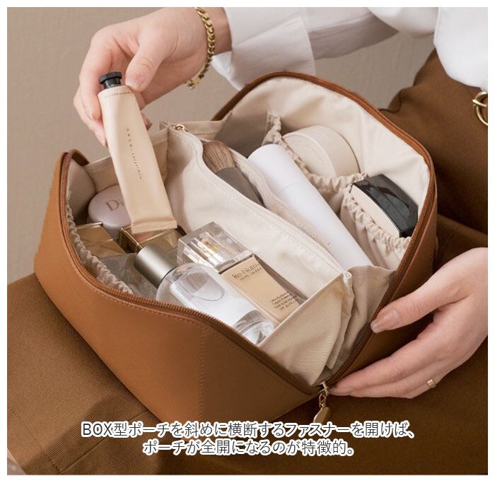 ・BOX型ポーチを斜めに横断するファスナーを開けば、ポーチが全開になるのが特徴的。
