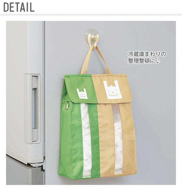 レジ袋やポリ袋をまとめて収納&簡単に取り出せレジ袋ストッカーです。大小2種類の サイズに分別し、ストックできるのがポイントです。前側がメッシュ仕様になっていて、量が一目で分かるようになっています。サイドにはレシートなどが入るポケットや輪ゴム掛けがついていてとても便利です。