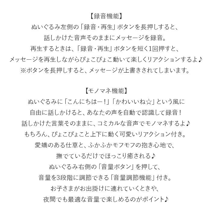 ・「録音・再生&モノマネ」の2通りで楽しく遊べる♪録音機能がついた「まねまね・ぬいぐるみ」が仲間入り!