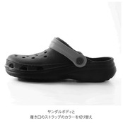 ・サンダルボディと履き口のストラップのカラーを切り替えたシックな色使いで、タウンユースや室内用サンダルにも使いやすい!ストラップ側面のスマイルマークがちょこんと可愛いアクセントに。
