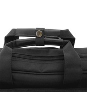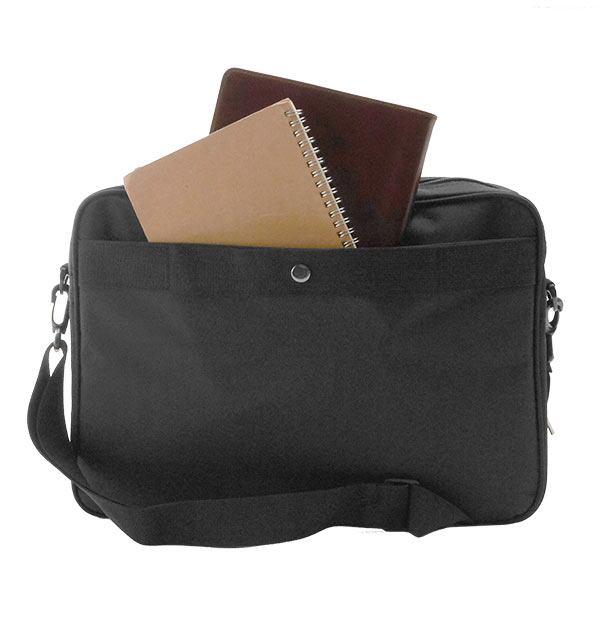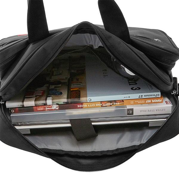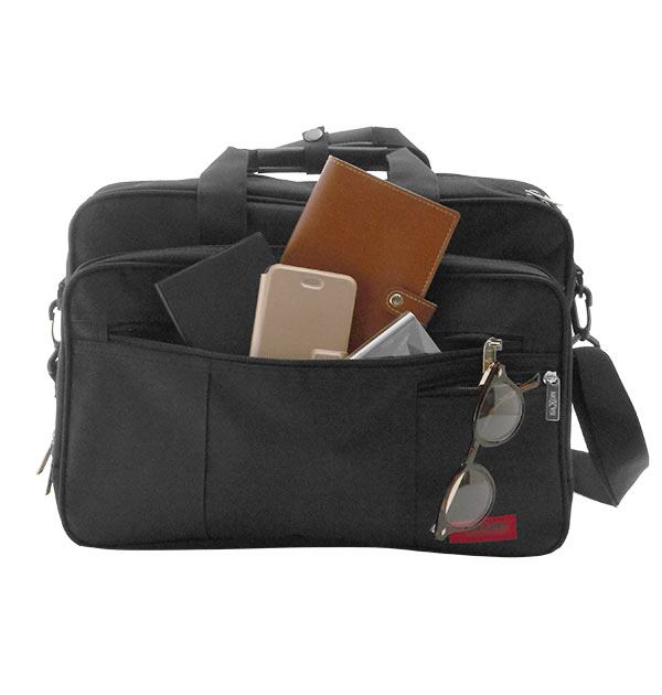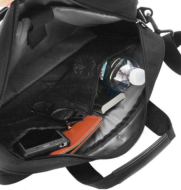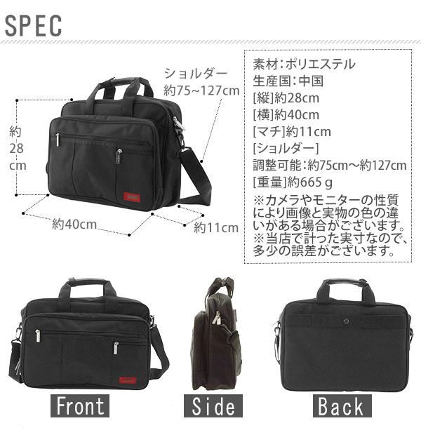 豊富なポケットの2way(肩掛け、手提げ)ビジネスバッグ。スマホやペンなども入るポケット付きで、クッションの付いたノートPCが入るスペースも。背面にはキャリーバッグの持ち手に通せるベルト付き。