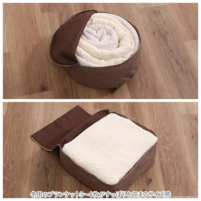 ・冬用のブランケット3〜4枚がすっぽりと収まるサイズ感。カバーの開口部はダブルファスナーが大きく開いて、ボリュームのある毛布でも出し入れが楽ちん。