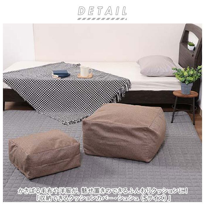 ・かさばる毛布や洋服が、魅せ置きのできるふんわりクッションに!「収納できるクッションカバー・シュシュ(Sサイズ)」