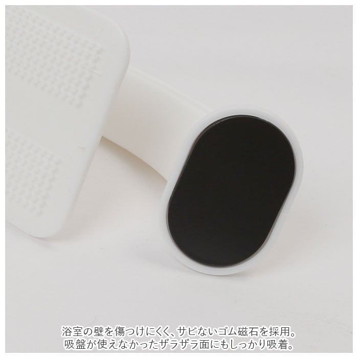 ・浴室の壁を傷つけにくく、サビないゴム磁石を採用。吸盤が使えなかったザラザラ面にもしっかり吸着。(※鋼板を使用していない壁、タイル、木、大きな凸凹のある壁、ガラス等にはご使用いただけません。)