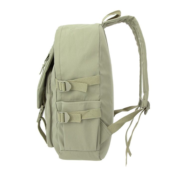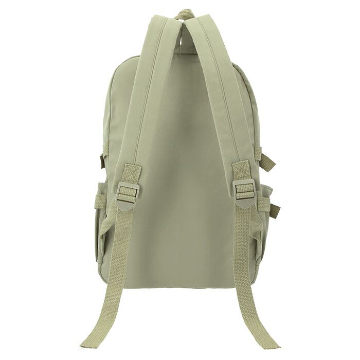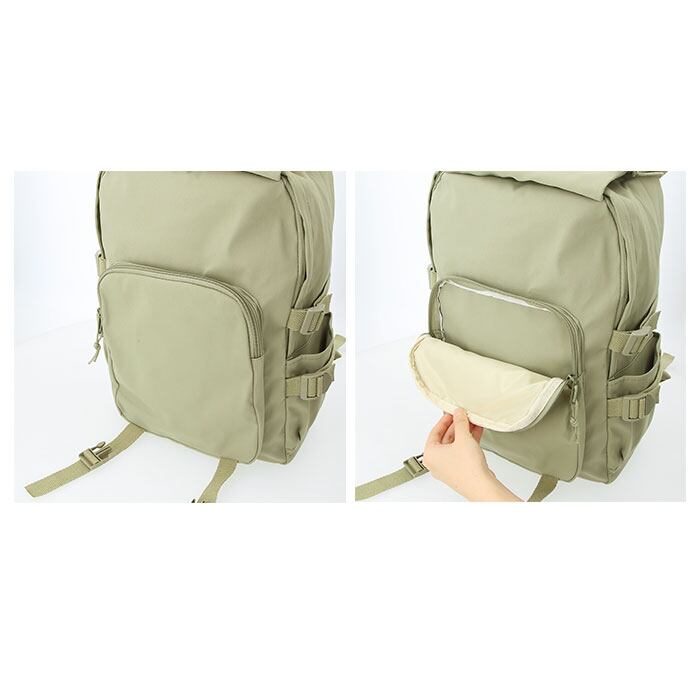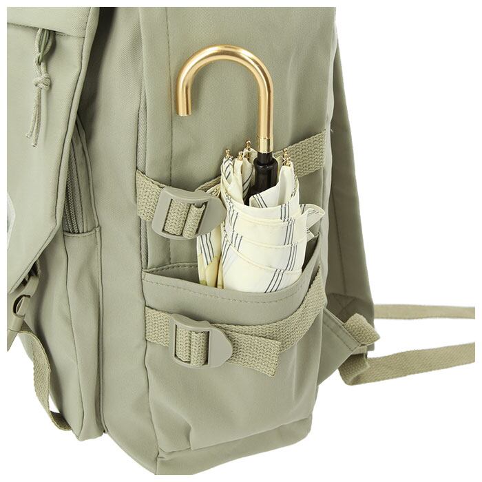 ・リュックの表面にはファスナー式のアウトポケット×2を装備し、両サイドには水筒や折りたたみ傘を入れるのに便利なオープンポケット付き。