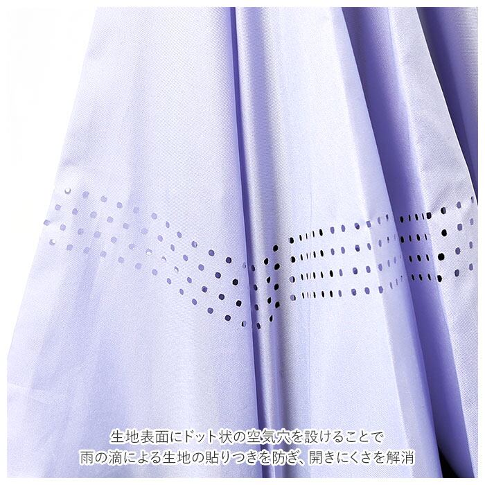 ・生地表面にドット状の空気穴を設けることで、雨の滴による生地の貼りつきを防ぎ、開きにくさを解消。