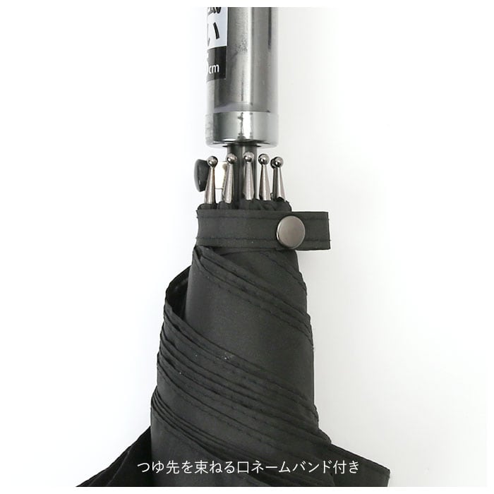 ・傘生地を留める胴ネームバンドはスナップボタン式。さらにつゆ先を束ねる口ネームバンド付き。