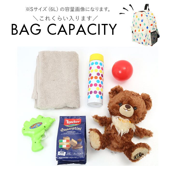 ・お子さまの体の大きさに合わせて選べる2サイズ展開。容量はSサイズが6L、Mサイズが10L。