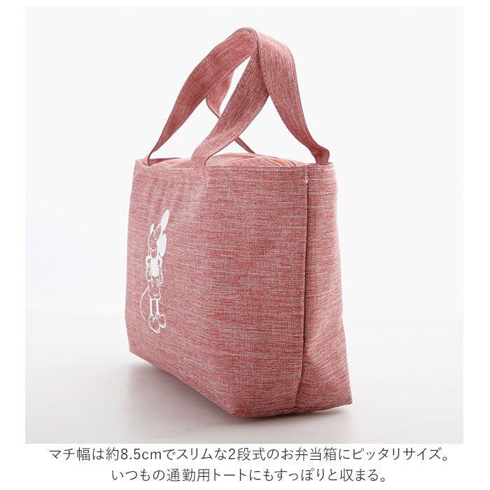・お弁当の時間が楽しくなる、表情豊かなミッキー柄のシンプルランチトート。マチ幅は約8cmでスリムな2段式のお弁当箱にピッタリサイズ。いつもの通勤用トートにもすっぽりと収まる!