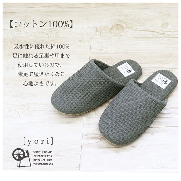 ・素足で履きたくなる心地よさ♪綿花のみで撚ったコットンを使用した「yori ヨリソフトスリッパ」。