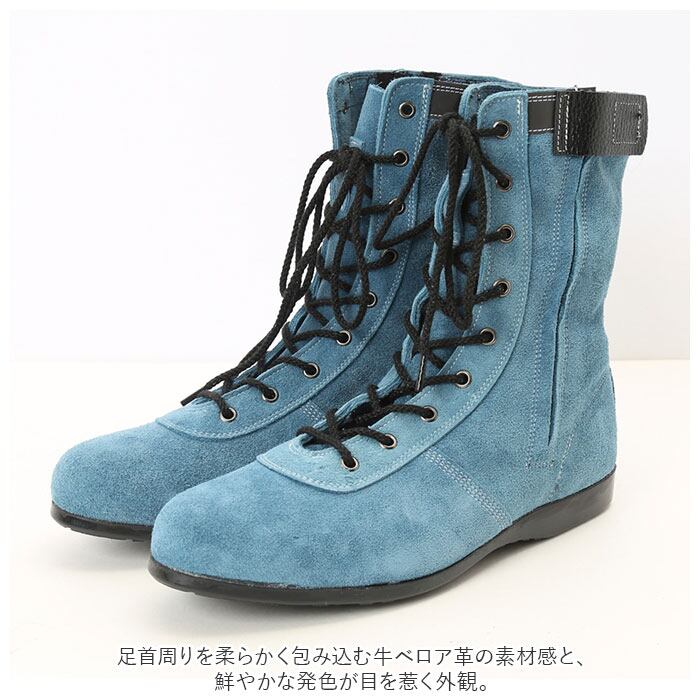 ・足首周りを柔らかく包み込む牛ベロア革の素材感と、鮮やかな発色が目を惹く外観。