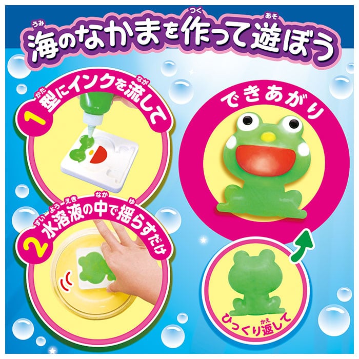 ・化学反応によってぷくっと固まる液体で作って遊ぼう♪6色のカラーインク入り「ぷにょぷにょシリーズ」が登場。(対象年齢6歳から)