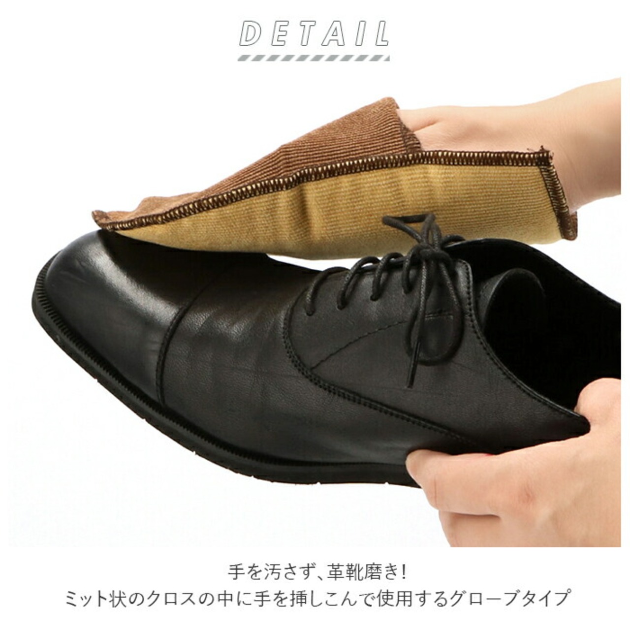 ・ミット状のクロスの中に手を挿しこんで使用するグローブタイプ!靴磨きクリームや汚れに直接触れずに作業できるので、手が汚れず素早く作業できる。