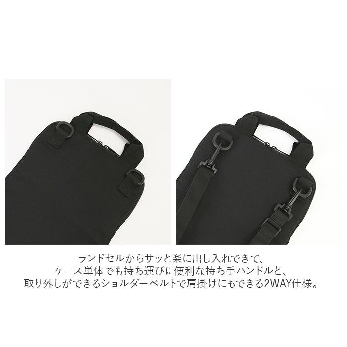 ・ランドセルからサッと楽に出し入れできて、ケース単体でも持ち運びに便利な持ち手ハンドルと、取り外しができるショルダーベルトで肩掛けにもできる2WAY仕様。