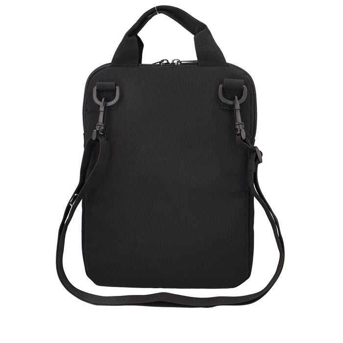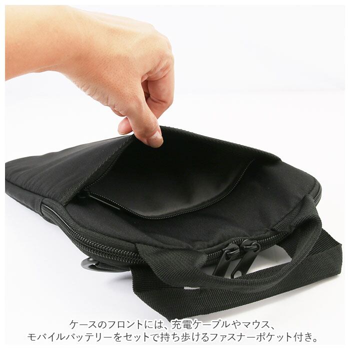 ・ケースのフロントには、充電ケーブルやマウス、モバイルバッテリーをセットで持ち歩けるファスナーポケット付き。